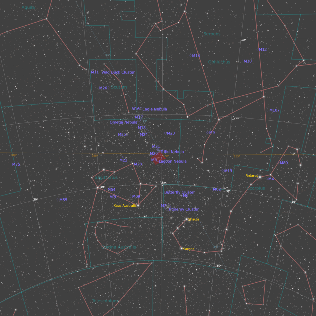 Ime: M8, Sh2-25, RCW 146, LBN 25, Lagoon (Hourglass region) nebula