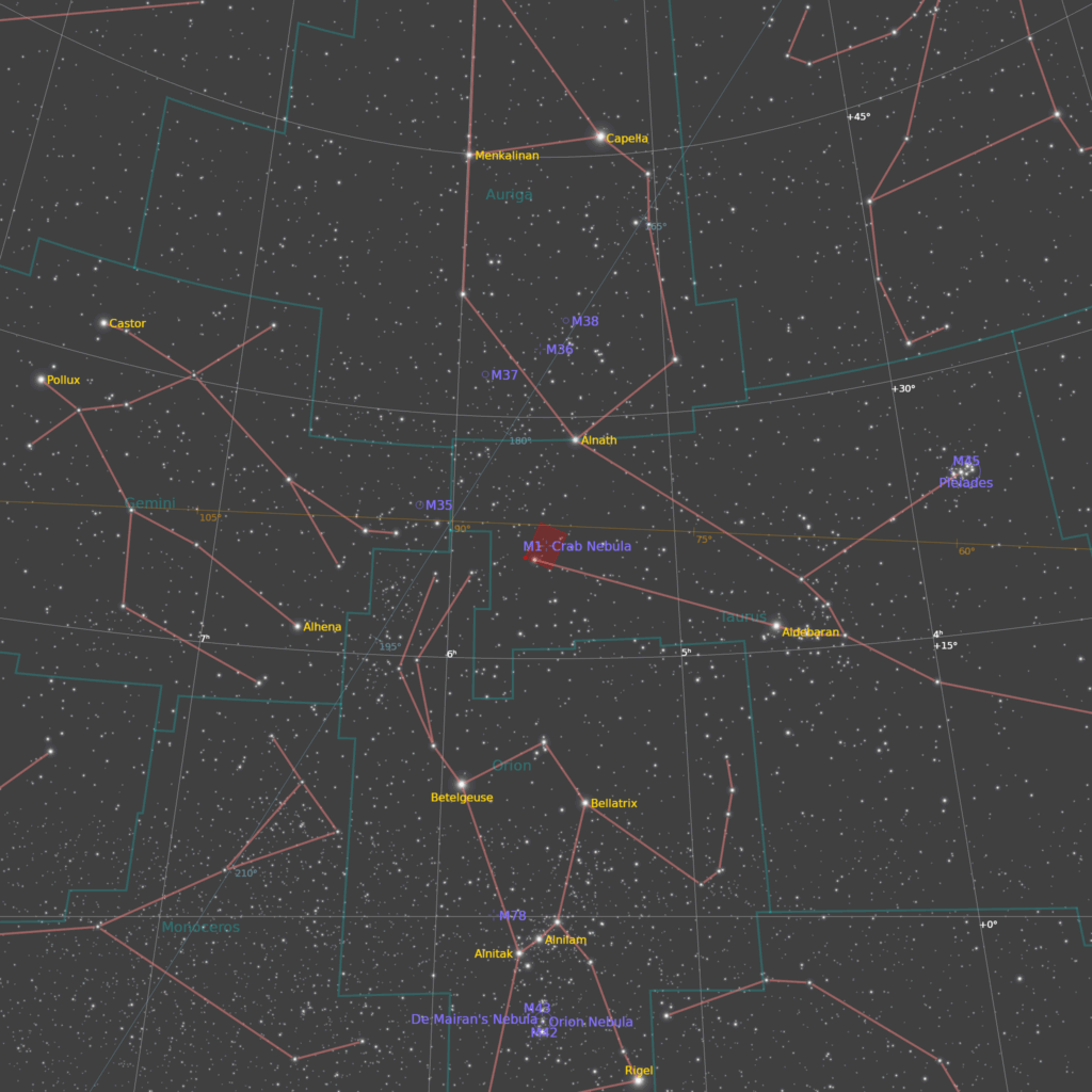 Ime: M1, NGC1952, Sh2-244, LBN833, Ced 53, SNR G184.6-05.8, Crab (Taurus A) nebula
