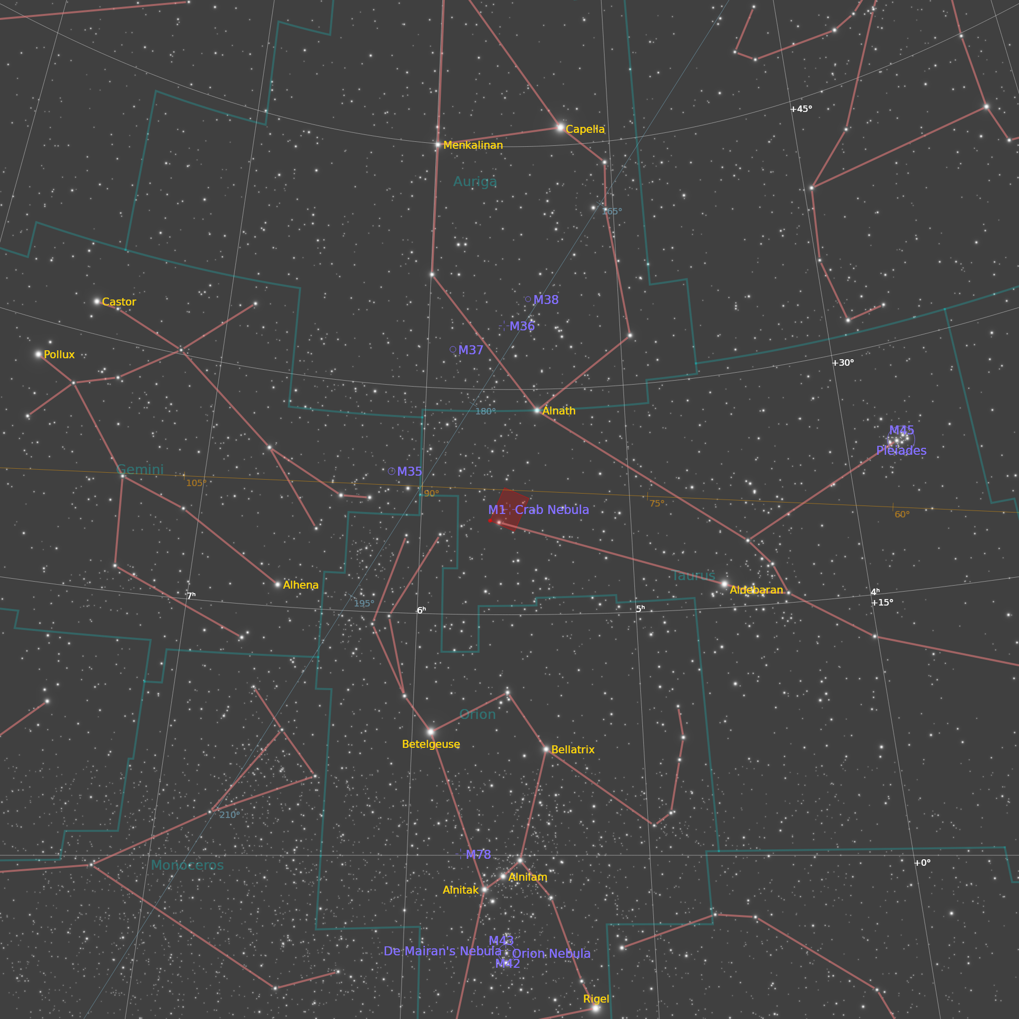 Crab nebula (M1 odnosno Messier 1) nalazi se u severnom delu sazveždja Bik. Ima prividnu magnitudu od 8,4 i može da se vidi dvogledom pri dobrim uslovima gledanja. Crab nebula rezultat je eksplozije supernove SN 1054, koju su primetili kineski astronomi 1054. godine. Bio je to prvi objekat dubokog neba koji je povezan sa eksplozijom supernove. Messier 1 (M1) udaljena je oko 6.500 svetlosnih godina, ima oko 11 svetlosnih godina u prečniku i nastavlja da se širi brzinom od oko 1.500 kilometara u sekundi. Ostatak supernove sadrži Crab Pulsar, brzo rotirajuću neutronsku zvezdu koja se vrti brzinom od 30,2 puta u sekundi. Pulsar emituje zračenje u optičkim, radio, ultraljubičastim, rendgenskim i gama talasnim dužinama.