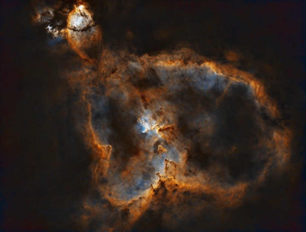 Maglina Srce je emisiona maglina, udaljena 7.500 svetlosnih godina od Zemlje i smeštena u Perzejevom kraku galaksije u sazveždju Kasiopeja. Prikazuje svetleći jonizovani vodonikov gas i tamnije trake prašine. Najsvetliji deo magline (čvor na njenom zapadnom rubu) zasebno je klasifikovan kao NGC 896, jer je to bio prvi deo magline koji je otkriven. Njena morfologija potaknuta je zračenjem koje dolazi iz malog skupa zvezda u blizini središta magline. Ovo otvoreno jato zvezda sadrži nekoliko sjajnih zvezda gotovo 50 puta većih od Sunčeve mase, i mnogo više slabih zvezda koje su samo delić Sunčeve mase. Maglina Srce takodje se sastoji od jonizovanog kiseonika i sumpornih gasova, odgovornih za bogate plave i narandžaste boje koje se vide na uskopojasnim slikama. Oblik magline pokreću zvezdani vetrovi iz vrućih zvezda u njenom jezgru. Maglina takodje ima raspon od gotovo 2 stepena na nebu, pokrivajući područje četiri puta veće od promera punog Meseca.