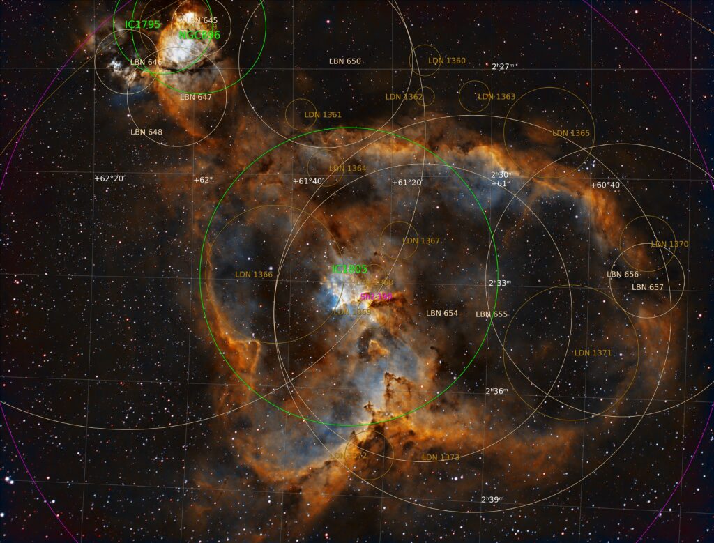 Ime: IC1805,Sh2-190,LBN654,Cr26,Mel15,Ced7,Heart (Running Dog, Valentine, AFGL333) nebula