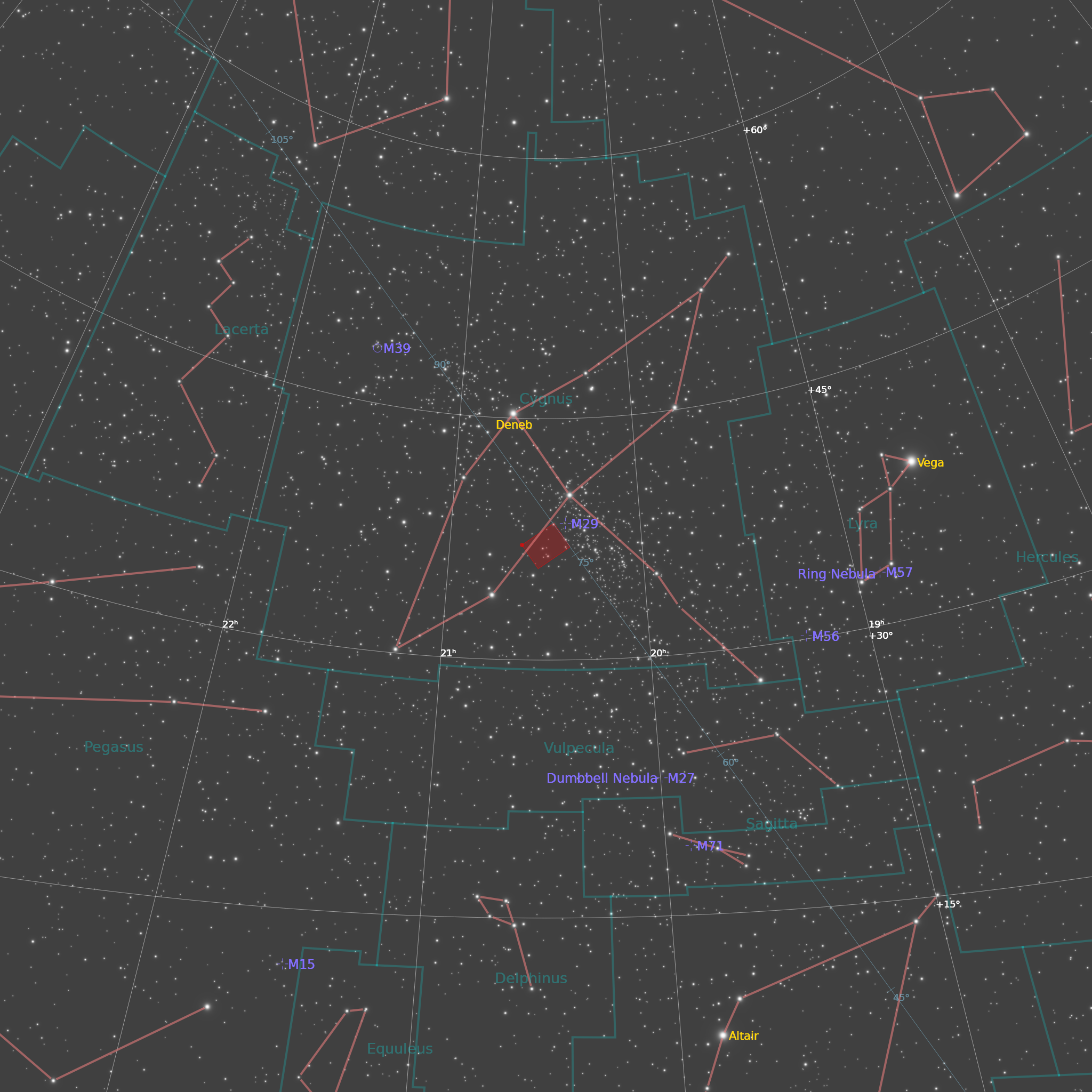 Plava refleksiona maglina jugoistočno od nje nosi oznaku LBN218. To je prašnjava maglina slabog sjaja sa uglovnim prečnikom od oko 10 uglovnih minuta, koja okružuje varijabilnu dvojnu zvezdu 44 Labuda i odbija njenu svetlost. Komponente 44 Labuda su 6,2 i 10,1 magnitude medjusobno udaljene 2,2 uglovne sekunde udaljene od nas oko 4000 svetlosnih godina.