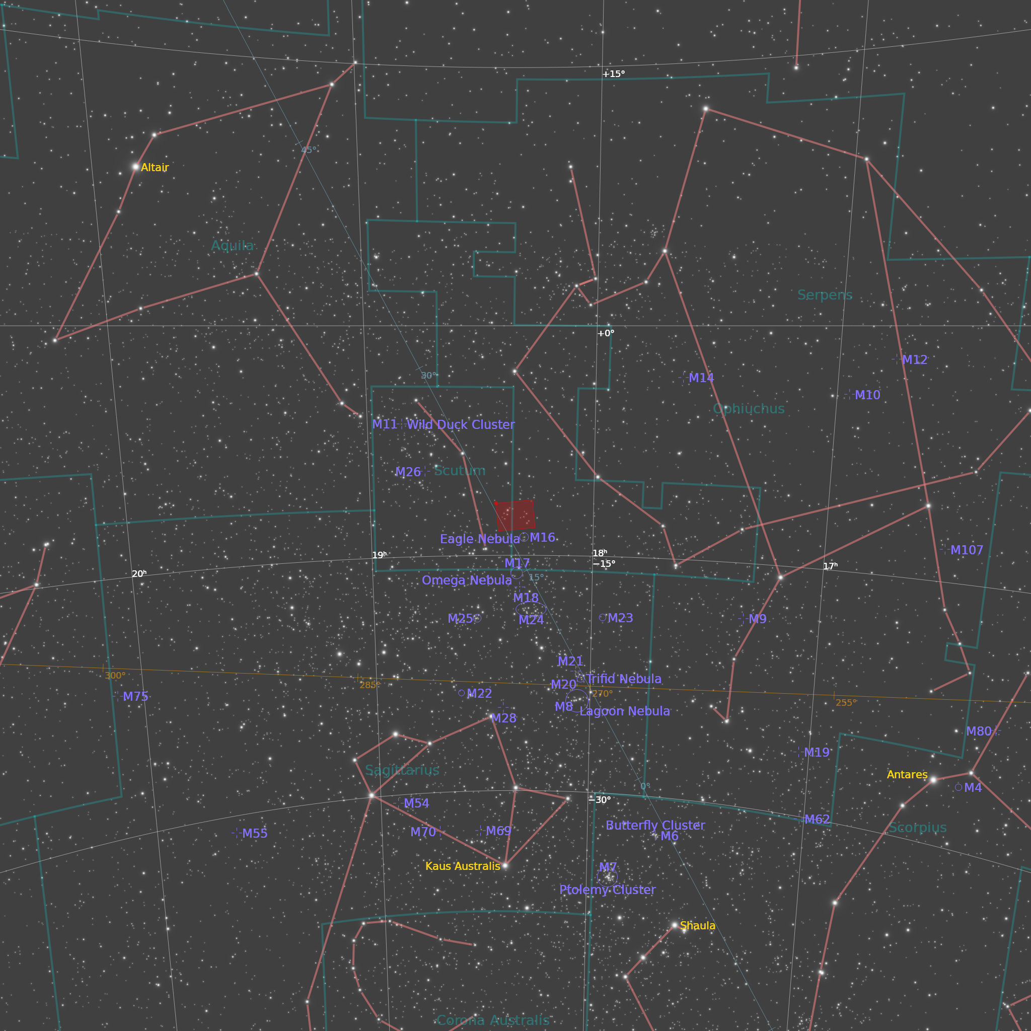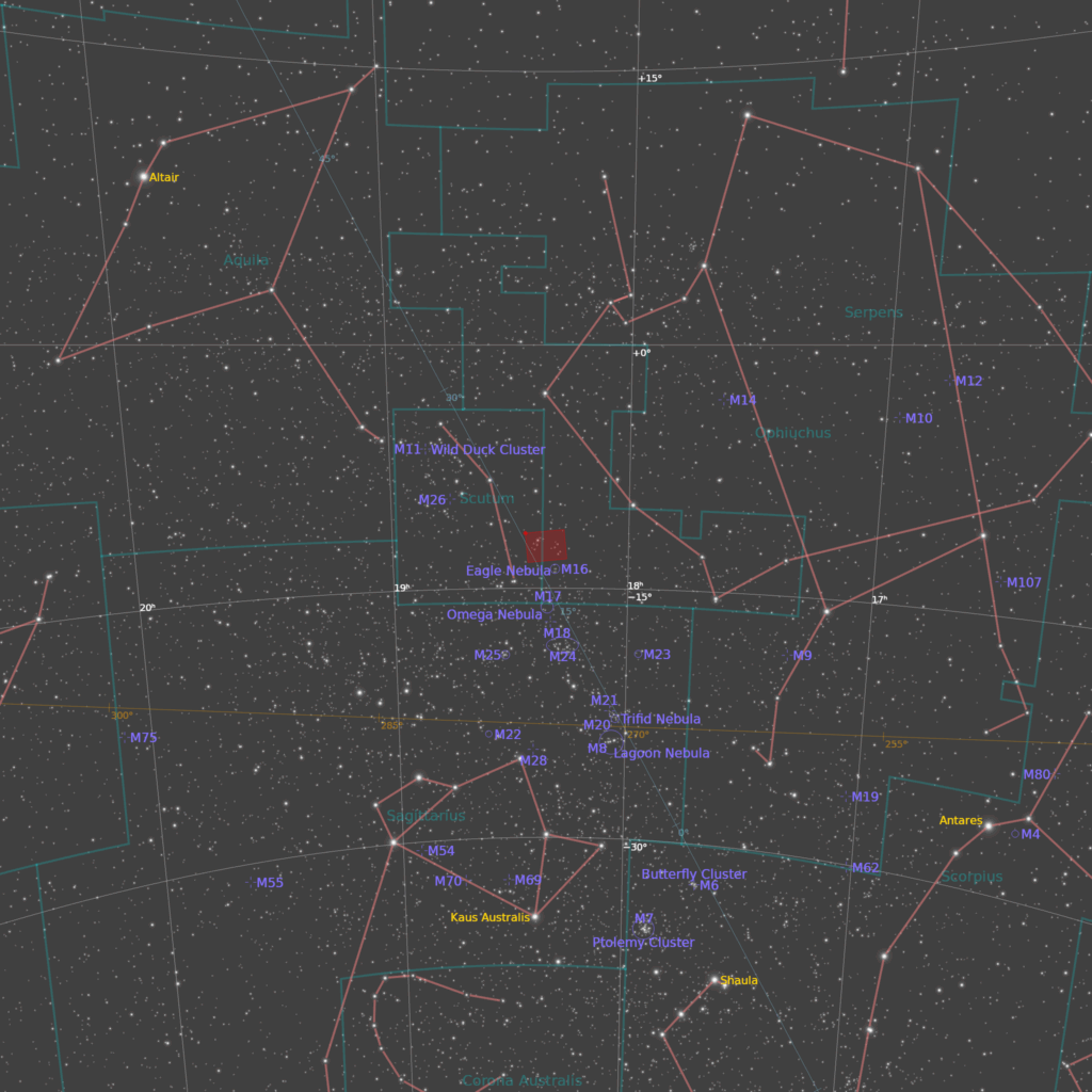Na donjem levom uglu slike nalazi se slaba emisiona maglina Sh2-53 – područje jonizovanog vodonikovog gasa na udaljenosti od oko 12 400 svetlosnih godina.