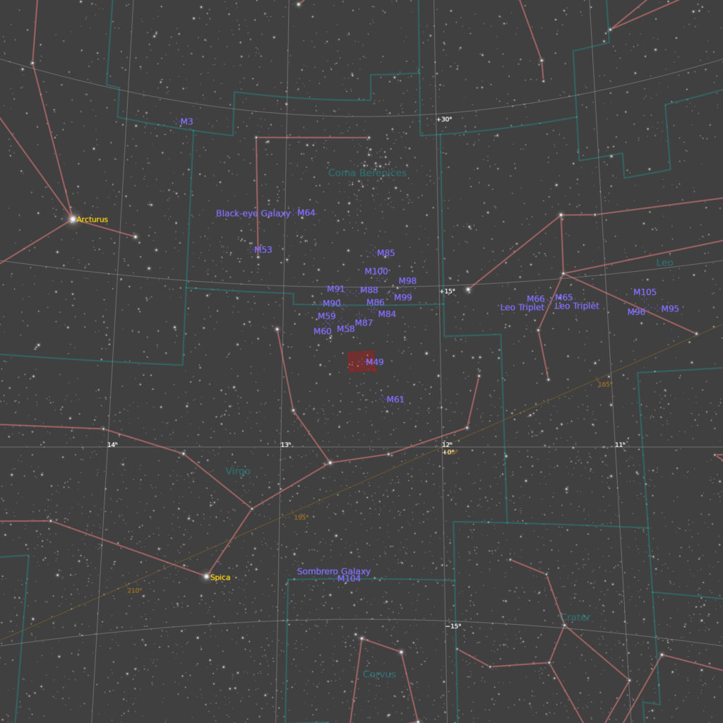 Eliptičnu galaksiju M49 otkrio je Charles Messier 1771. Ne samo da je to bio prvi objekat otkriven u jatu galaksija Device, već je to bila i prva eliptična galaksija otkrivena van lokalne grupe Mlečnog puta. Za razliku od spiralnih galaksija koje imaju dobro definisane strukture i slikovite spiralne krakove, eliptične galaksije su prilično beznačajne sa malo strukture. Zvezde u eliptičnim galaksijama obično su mnogo starije od onih u spiralnim galaksijama. M49 takodje sadrži bogatu kolekciju kuglastih zvezdanih jata — gotovo 6000. Postoji izvor X-zraka u jezgru galaksije, što ukazuje da supermasivna crna rupa vreba u središtu M49. Procenjena masa ove supermasivne crne rupe je otprilike 565 miliona puta veća od mase našeg Sunca. M49 se nalazi 60 miliona svetlosnih godina od Zemlje u sazveždju Device. Ima prividnu magnitudu od 9,4 i može da se posmatra pomoću dvogleda. Najbolje vreme za posmatranje galaksije je tokom meseca maja.