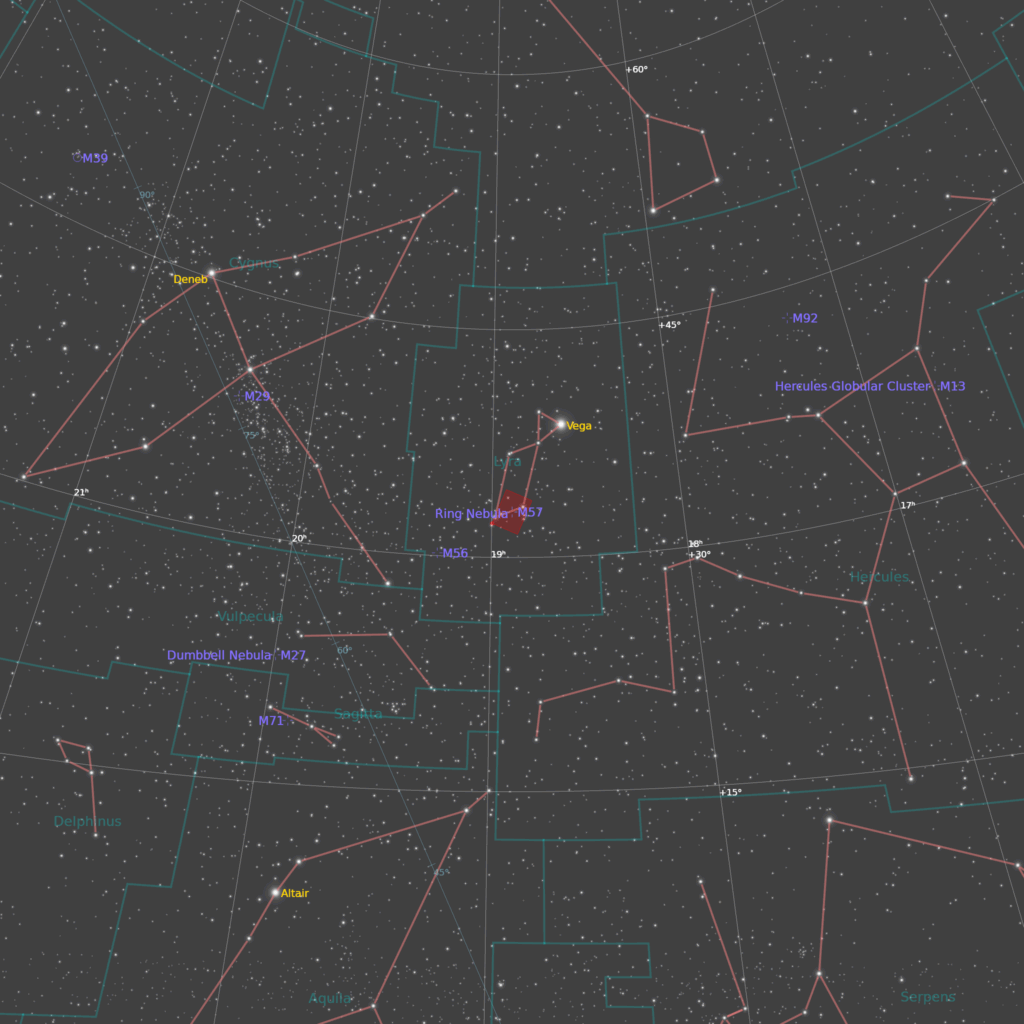 M57 ili Prstenasta maglina je planetarna maglina, sjajni ostaci zvezde nalik Suncu. Sićušna bela tačka u središtu magline je vruće jezgro zvezde, koja se naziva beli patuljak. M57 udaljena je oko 2000 svetlosnih godina u sazveždju Lire, a najbolje se posmatra tokom avgusta. Prstenasta maglina ima prividnu magnitudu od 8,8. Lako ju je pronaći, budući da se nalazi otprilike na pola puta između dve zvezde 3. magnitude “Sheliak” i “Sulafat” koje čine dno Lyrine lire. Potreban je teleskop srednje veličine da bi se videli njeni prekrasni prstenasti detalji. M57 je nagnuta prema Zemlji tako da astronomi vide prsten licem u lice.