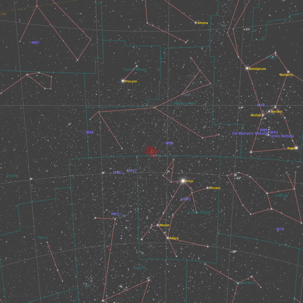 U donjem desnom delu snimka nalazi se emisiona maglina Sh2-294 popularno nazvana Oktopus. Pripada sazveždju Jednorog u blizini poznate magline Galeb.