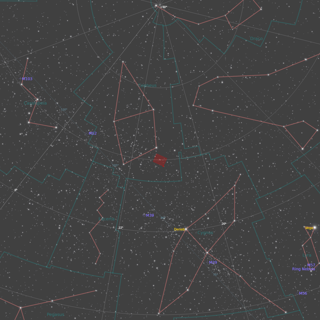 Crveni signal (Ha) je Sh2-129 – maglina Slepi Miš. Plava maglina (O3) je Lignja u Cefeju, u katalogiu kao Ou4 i nalazi se unutar magline Slepi miš. Lignja je izuzetno bleda i zahtevna za fotografisanje a otkrivena je tek 2011. godine. Plavo-zelena emisija magline Lignje dolazi od dvostruko jonizovanih atoma kiseonika. Iako je očigledno potpuno okružena crvenkastim područjem emisije vodonika Sh2-129, stvarnu udaljenost i prirodu magline Lignja bilo je teško odrediti. Novija istraživanja sugerišu da Ou4 zaista leži unutar Sh2-129 udaljena nekih 2300 svetlosnih godina. U skladu sa tim scenarijem, Ou4 bi predstavljao spektakularno isticanje koje pokreće HR8119, trostruki sastav vrućih, masivnih zvezda koje se vide u blizini središta magline. Ogromna maglina Lignje fizički bi imala gotovo 50 svetlosnih godina u promeru.