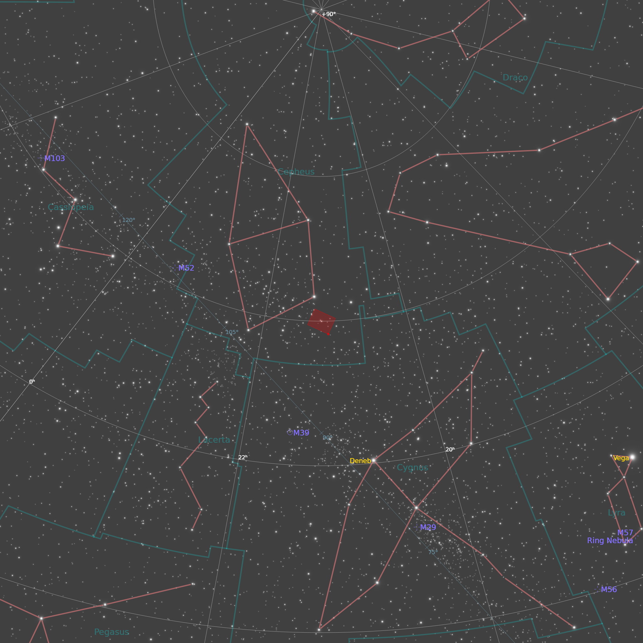 Crveni signal (Ha) je Sh2-129 – maglina Slepi Miš. Plava maglina (O3) je Lignja u Cefeju, u katalogiu kao Ou4 i nalazi se unutar magline Slepi miš. Lignja je izuzetno bleda i zahtevna za fotografisanje a otkrivena je tek 2011. godine. Plavo-zelena emisija magline Lignje dolazi od dvostruko jonizovanih atoma kiseonika. Iako je očigledno potpuno okružena crvenkastim područjem emisije vodonika Sh2-129, stvarnu udaljenost i prirodu magline Lignja bilo je teško odrediti. Novija istraživanja sugerišu da Ou4 zaista leži unutar Sh2-129 udaljena nekih 2300 svetlosnih godina. U skladu sa tim scenarijem, Ou4 bi predstavljao spektakularno isticanje koje pokreće HR8119, trostruki sastav vrućih, masivnih zvezda koje se vide u blizini središta magline. Ogromna maglina Lignje fizički bi imala gotovo 50 svetlosnih godina u promeru.