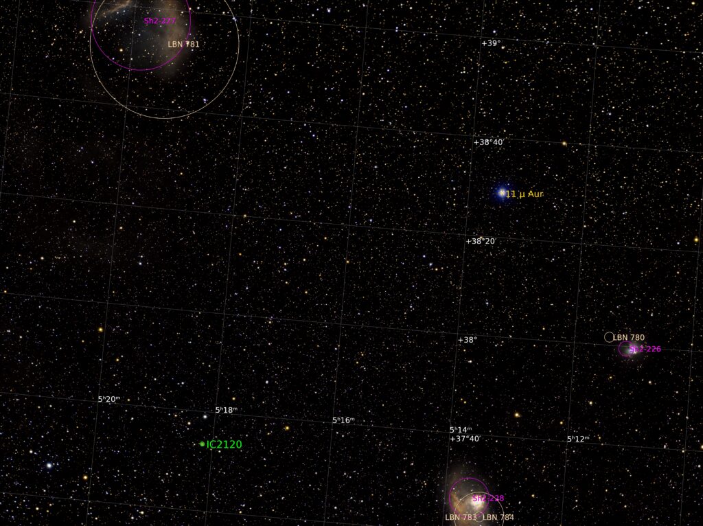 Ova slika prikazuje slabe magline rasute oko zvezde μAur, koja se nalazi 7,5 stepeni južno od zvezde Capella u petougaonom sazveždu Auriga. Sh2-226 je sa desne strane veličine 2 uglovna minuta, a Sh2-228, koja je vidljiva dole na slici, najfotografisanija je, ujedno najsvetlija od ovih maglina i ima proširenje od oko 8 uglovnih minuta. Sh2-227 je maglina sa prividnim prečnikom većim od 20 uglovnih minuta u gornjem levom uglu. Gotovo je kružna i može se videti da unutra postoji neravnina.