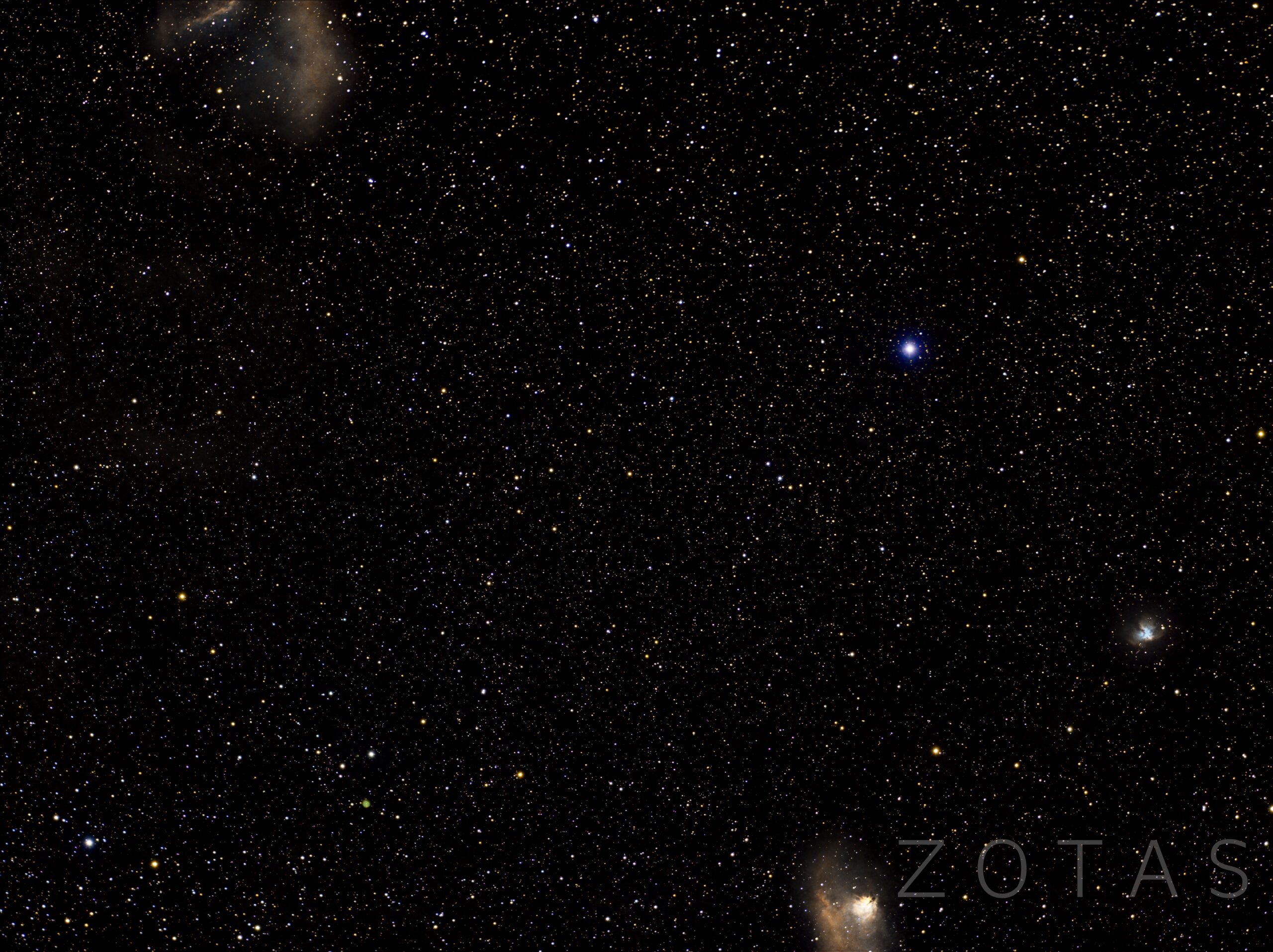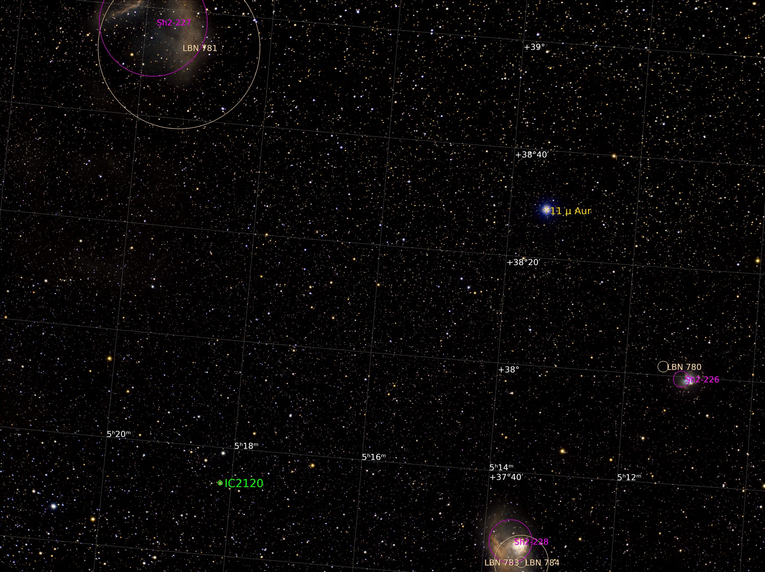 Ova slika prikazuje slabe magline rasute oko zvezde μAur, koja se nalazi 7,5 stepeni južno od zvezde Capella u petougaonom sazveždu Auriga. Sh2-226 je sa desne strane veličine 2 uglovna minuta, a Sh2-228, koja je vidljiva dole na slici, najfotografisanija je, ujedno najsvetlija od ovih maglina i ima proširenje od oko 8 uglovnih minuta. Sh2-227 je maglina sa prividnim prečnikom većim od 20 uglovnih minuta u gornjem levom uglu. Gotovo je kružna i može se videti da unutra postoji neravnina.