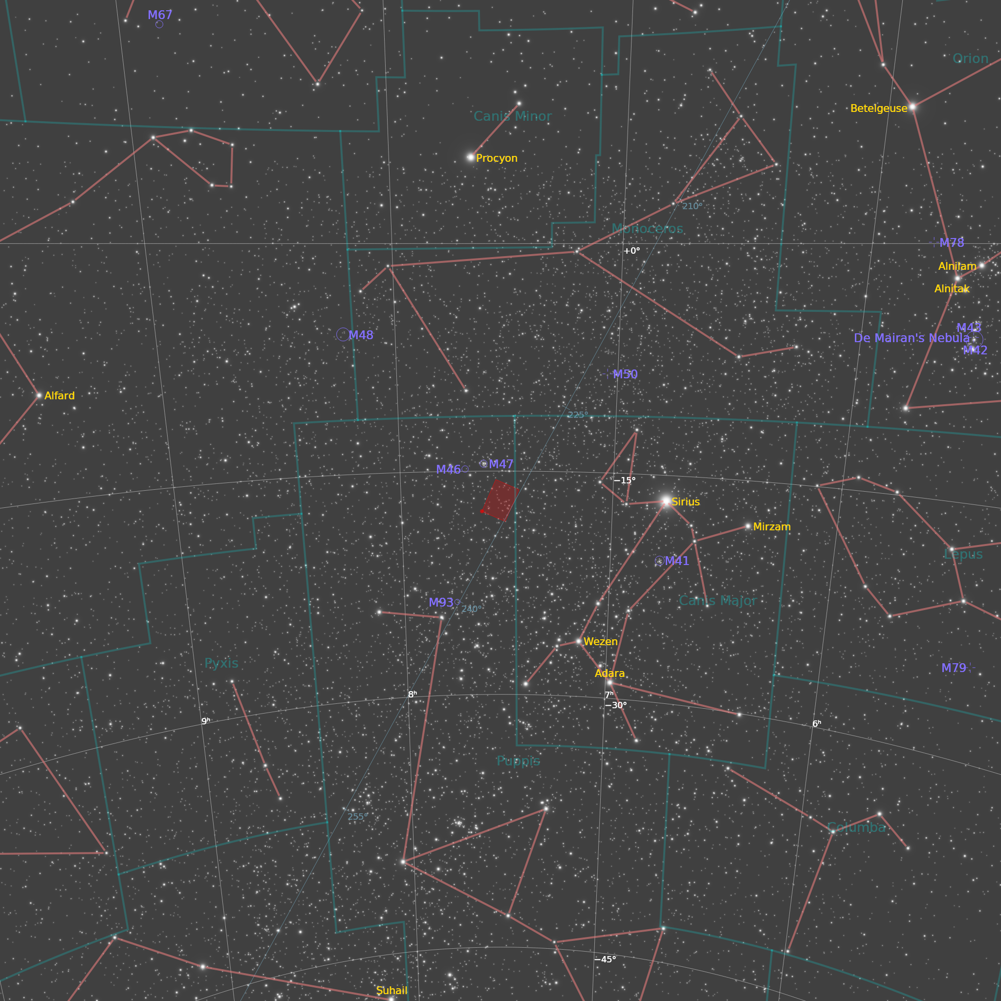 Okrugla crvenkasta maglina Sh2-302, nazvana Sneško smeštena je blizu granice izmedju sazveždja Puppis i Canis Majoris. Maglina ima vizuelni prečnik od oko 15 uglovnih minuta, a može se videti i tamna traka u istočnoj regiji. Sh2-302 je udaljena oko 5.800 svetlosnih godina i smatra se delom ogromne Gumove magline koja zimi zauzima oko 36 stepeni nisko na južnom delu neba.